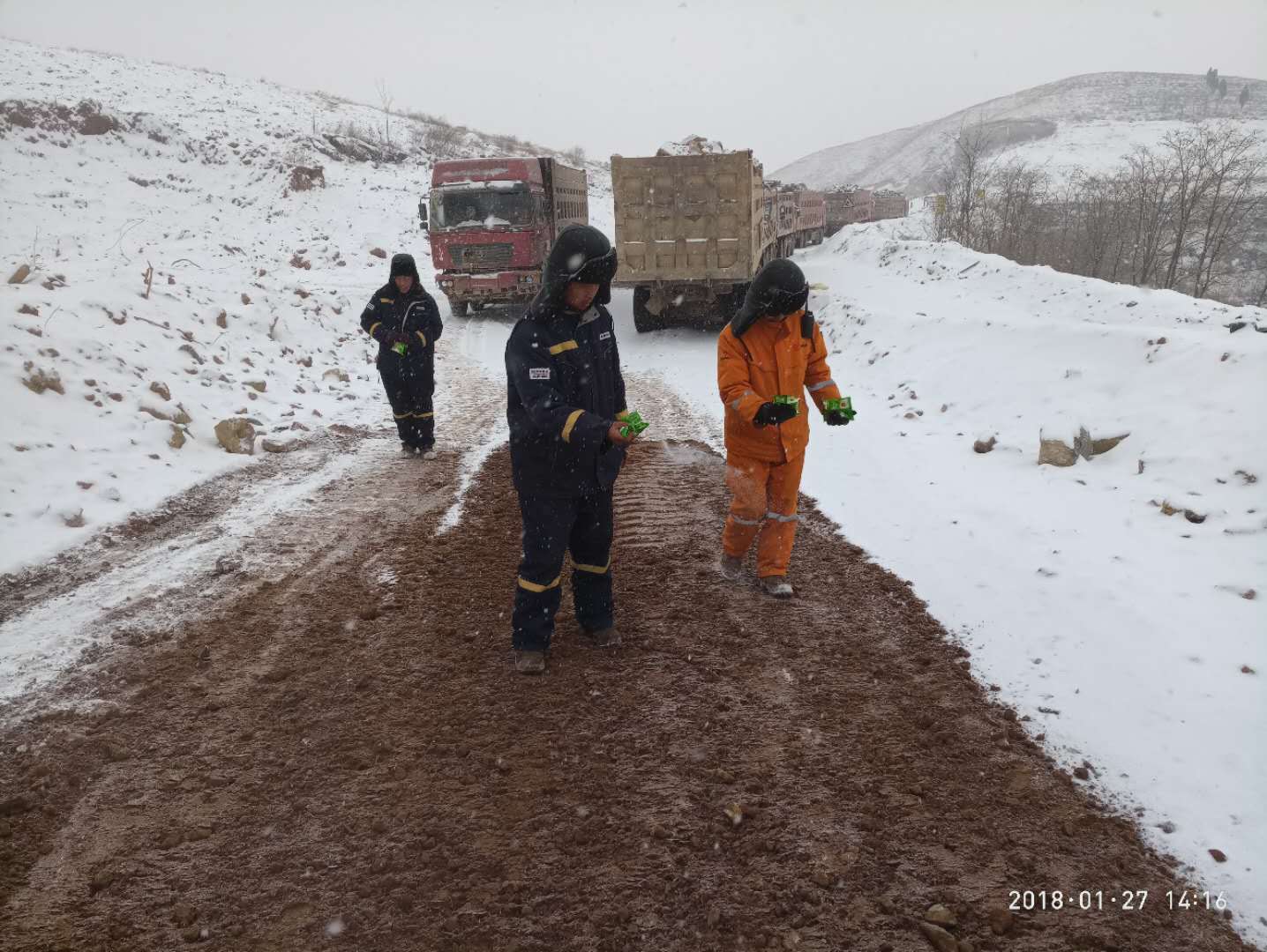 -----兗州中材禹州分公司趕工生產(chǎn)場記 雪花,仿佛在此迷了路,不知疲倦地,連續(xù)三天三夜,一片又一片,鋪天蓋地般伴隨著透骨的寒風(fēng),利刃似的迎面而來…… 數(shù)九寒天,持續(xù)低溫,千里冰封,萬里雪飄,整個世界好像變成了一只巨大無比的冰箱,山川冷地顫抖,路面凍地僵硬,就連空氣,似乎也要凝固起來。 安全生產(chǎn)大于天!已是寒冬臘月,年關(guān)將至,為了能在1月21日到2月10日為期20的天生產(chǎn)期限內(nèi)正常供礦,滿足水泥廠順利生產(chǎn)的需求,禹州分公司的全體員工們正夜以繼日、廢寢忘食的堅(jiān)守在生產(chǎn)最前線。 面對糟糕天氣帶來的種種不利生產(chǎn)因素,他們沒有退縮,也沒有氣餒,更沒有逃避:冰天雪地,道路本來就滑得連走路都異常謹(jǐn)慎、艱難,而被運(yùn)輸車輛來來回回碾壓過的運(yùn)礦道路更是如履薄冰!安全隱患不容小覷,及時、合理、有效的解決措施更是刻不容緩!現(xiàn)場管理人員迅速調(diào)動裝載機(jī)用土石鋪墊路面。 然而,剛剛鋪好的“安心”路面很快又被不停飄落的雪花覆蓋了、掩埋了,大家又立即采取了人工往運(yùn)礦道路上撒鹽的辦法來融雪化冰,以達(dá)到安全生產(chǎn)、穩(wěn)產(chǎn)的目的。 緊繃安全生產(chǎn)的琴弦,現(xiàn)場管理人員們時刻眼觀六路,耳聽八方,腳不停歇。白茫茫的礦山上時不時走動著這些忙碌的可愛“雪人們”,他們在認(rèn)真負(fù)責(zé)地指揮挖機(jī)師傅如何合理挖裝;他們在耐心十足的警醒汽車司機(jī)放慢車速、平穩(wěn)倒料、安全第一;他們再仔細(xì)檢查、巡視每一個可能出現(xiàn)安全紕漏的角落。 大地一片銀白,一片潔凈,夜已很深,而雪花,仍如柳絮,如鵝毛,如棉花,從無邊無際的天空中不知倦怠的飄飄灑灑,寒風(fēng)怒吼著呼嘯而過,低溫仍在繼續(xù)發(fā)酵!天寒地凍里,不畏嚴(yán)寒風(fēng)霜,不懼艱難險阻、勇于吃苦耐勞的禹州分公司的全體員工依舊未眠,他們正用滿腔的青春熱血和積極飽滿工作熱情來燃燒、來暖化這萬里冰山...... 兗州中材建設(shè)有限公司禹州分公司 2018年1月27日 |