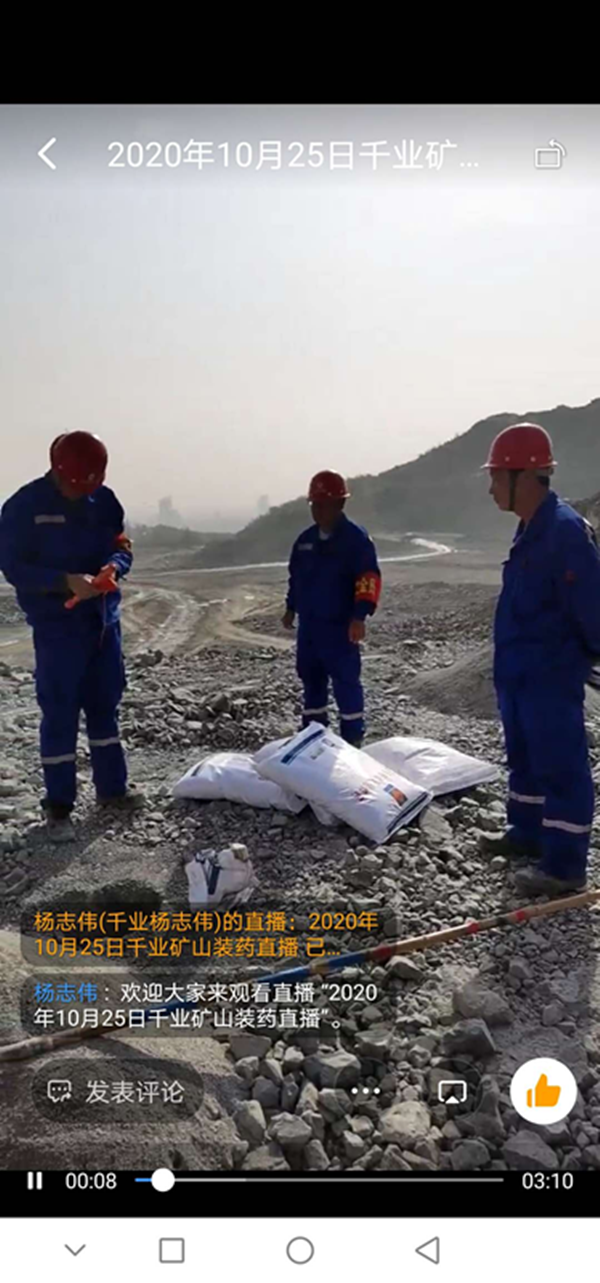 近日,焦作市公安局支隊領(lǐng)導按照河南省廳民爆未端管控全視頻要求,建立了覆蓋全市可視頻的釘釘群,組織了焦作市轄區(qū)爆破作業(yè)人員本群,對爆破作業(yè)進行全程跟蹤管理。馬村分公司積極響應南省民爆末端管控全視頻要求,組織爆破作業(yè)相關(guān)人員進入“焦作市爆破作業(yè)管控群”,利用將爆破現(xiàn)場進行直播,主要直播人員到位情況(三大員及工程技術(shù)人員是否到位)、卸車、電子雷管入庫、裝填、起爆等視頻。 在爆破作業(yè)中,首先,現(xiàn)場人員全部到位,包括爆破工程技術(shù)人員1名,爆破員2名,安全員1名,保管員2名,持各自人員名片進行報到。  當運輸巖石粉狀大包和電子雷管的車到達作業(yè)地點后,對數(shù)量進行清點,卸車。直播開始。  下圖為將電子雷管進行入庫。  下圖為爆破員進行裝填直播。 最后,起爆直播。 馬村分公司經(jīng)過三天釘釘視頻直播的摸索與實踐,逐步建立起完整可行的直播過程,且受到市局相關(guān)領(lǐng)導的口頭表揚。馬村分公司將會一直嚴格按照焦作市局要求,利用釘釘直播,實現(xiàn)民爆末端管控全視頻要求。 |