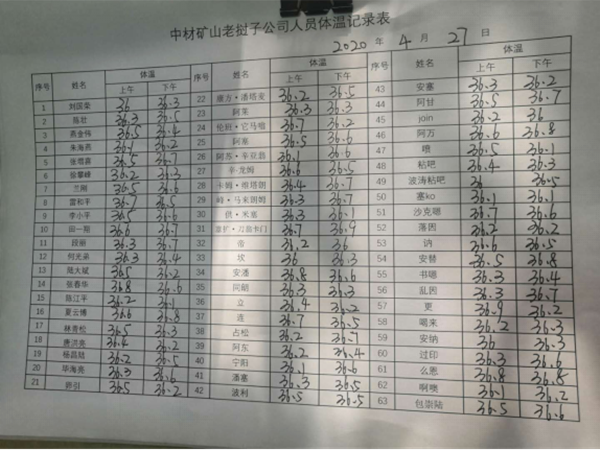 根據(jù)老撾衛(wèi)生部2020年4月28日下午2點(diǎn)半的數(shù)據(jù)更新,老撾已經(jīng)連續(xù)16日未出現(xiàn)新的新冠病例,從1月份到4月28日,累計(jì)檢測(cè)1815例,累計(jì)排除1796例,累計(jì)確診19例,累計(jì)治愈出院7例,現(xiàn)存12例,11例在萬(wàn)象150友誼醫(yī)院,1例在瑯勃拉邦省醫(yī)院,均為輕微癥狀。 隨著新型冠狀肺炎在全球蔓延,疫情防控形勢(shì)異常嚴(yán)峻,老撾項(xiàng)目部按照公司統(tǒng)一部署,加強(qiáng)領(lǐng)導(dǎo),高度重視,積極應(yīng)對(duì),采取有力措施,確保疫情防控和安全生產(chǎn)工作的順利進(jìn)行。 一、成立疫情期間突發(fā)事件應(yīng)急領(lǐng)導(dǎo)小組,建立健全安全防范工作機(jī)制,明確各小組成員職責(zé)劃分。 按照突發(fā)事件性質(zhì)、機(jī)理和發(fā)生過(guò)程分類為突發(fā)聚集性疫情、醫(yī)療防疫物資采購(gòu)和運(yùn)輸受限、境外項(xiàng)目醫(yī)療防疫物資和生活物資儲(chǔ)備不能滿足需要、醫(yī)療防疫物資和生活物資遭哄搶、中方員工或中外方員工之間發(fā)生群體性事件、項(xiàng)目營(yíng)地遭恐怖襲擊、人員緊急撤離回國(guó)、其他如綁架劫持等八類事件。根據(jù)項(xiàng)目所在地疫情形勢(shì)、社會(huì)治安狀況、物資供應(yīng)情況等外部條件以及突發(fā)事件的性質(zhì)、嚴(yán)重程度、可控性和影響范圍等因素,將項(xiàng)目疫情突發(fā)事件分為I級(jí)(特別重大)、II級(jí)(重大)、III級(jí)(較大)和IV級(jí)(一般)四個(gè)級(jí)別。并根據(jù)上述四個(gè)級(jí)別建立對(duì)應(yīng)四級(jí)響應(yīng)機(jī)制,建立相應(yīng)應(yīng)急預(yù)案并進(jìn)行演練。 二、編制各項(xiàng)應(yīng)急培訓(xùn) 1.項(xiàng)目全員進(jìn)行新冠病毒相關(guān)知識(shí)培訓(xùn),確保每人都能熟悉相關(guān)防疫知識(shí)。 2.防護(hù)措施、防護(hù)要領(lǐng)培訓(xùn),確保每名員工都能做好自身防護(hù),并充分認(rèn)識(shí)到做好自身防護(hù)的重要性。 3.特殊時(shí)期安保、安全意識(shí)再培訓(xùn),鞏固培訓(xùn)。 4.進(jìn)行各項(xiàng)專項(xiàng)應(yīng)急預(yù)案演練工作。   開展培訓(xùn)學(xué)習(xí) 三、采取各項(xiàng)預(yù)防措施 項(xiàng)目部本著“以人為本、預(yù)防為主、防治結(jié)合”的原則,牢固樹立“全員防疫”的思想意識(shí)。通過(guò)各種形式和途徑來(lái)宣傳疫情影響下可能帶來(lái)的突發(fā)事件及應(yīng)對(duì)措施。 1.疫情預(yù)防 1.1實(shí)時(shí)掌控老撾和項(xiàng)目所在地的疫情增長(zhǎng)情況,評(píng)估疫情風(fēng)險(xiǎn)。 1.2 疫情初期密切關(guān)注當(dāng)?shù)厣鐣?huì)疫情發(fā)展對(duì)物資供應(yīng)所產(chǎn)生的影響,不等不靠,主動(dòng)作為,利用各類資源多途徑多渠道籌措物資及時(shí)儲(chǔ)存足夠防疫、生活物資。 1.3 優(yōu)化各生產(chǎn)工種人員,精簡(jiǎn)部分當(dāng)?shù)貑T工、精簡(jiǎn)一些非必要崗位且傳播風(fēng)險(xiǎn)高的當(dāng)?shù)貑T工,如食堂幫工、項(xiàng)目駐地清潔工等。 1.4 優(yōu)化現(xiàn)場(chǎng)生產(chǎn)工作流程,減少或避免一些非必要的中方員工與當(dāng)?shù)貑T工接觸交流情況。 1.5 給當(dāng)?shù)貑T工配備口罩、護(hù)目鏡、手套等防護(hù)用品,上下班體溫監(jiān)測(cè)。 1.6 項(xiàng)目駐地、辦公場(chǎng)所、生產(chǎn)場(chǎng)所、生產(chǎn)生活車輛設(shè)備等每日定時(shí)定點(diǎn)消毒。 1.7 制定項(xiàng)目疫情防控規(guī)定,對(duì)防護(hù)物品佩戴、體溫測(cè)量、距離保持、聚餐等行為進(jìn)行嚴(yán)格規(guī)范和要求。 1.8加強(qiáng)職工食堂、員工宿舍的衛(wèi)生管理,防止交叉感染。 1.9 當(dāng)?shù)夭少?gòu)的生產(chǎn)生活物資嚴(yán)格執(zhí)行開箱前送貨車輛消毒、開箱后貨物消毒、入庫(kù)后再消毒多次全方位消毒措施。   部分雙語(yǔ)宣傳頁(yè)   部分防疫物資  體溫記錄表 2.其他突發(fā)事件預(yù)防 2.1以適當(dāng)?shù)那罍贤üこ膛従用耜P(guān)系。尊重當(dāng)?shù)貑T工,平等相待,和睦共處;人員雇傭時(shí),要兼顧所在地各社區(qū)利益,避免社區(qū)麻煩。項(xiàng)目駐地嚴(yán)格實(shí)行封閉管理制度,非上下班期間,禁止任何人員外出駐地。 2.2建立并保持與工程項(xiàng)目所在地政府機(jī)構(gòu)、治安機(jī)構(gòu)的聯(lián)系渠道。 2.3關(guān)注工程所在地和毗鄰地區(qū)社會(huì)治安動(dòng)向。發(fā)現(xiàn)工地、駐地周邊有可疑情況,及時(shí)采取應(yīng)對(duì)措施并向我國(guó)使(領(lǐng))館和當(dāng)?shù)卣畧?bào)告。 2.4 精簡(jiǎn)當(dāng)?shù)貑T工時(shí),并就工資、勞工補(bǔ)償?shù)冗_(dá)成協(xié)議,避免當(dāng)?shù)貑T工出現(xiàn)群體性事件。 2.5礦山增加夜間照明設(shè)備,安排人員24小時(shí)值班,防止偷盜、搶劫等。 2.6與員工開展談心活動(dòng),穩(wěn)定員工的思想和情緒;項(xiàng)目部領(lǐng)導(dǎo)和安全主管要定期或不定期與當(dāng)?shù)毓蛦T、司機(jī)交流,了解其思想動(dòng)態(tài),一旦發(fā)現(xiàn)有不好的苗頭,應(yīng)立即采取措施。 2.7告誡司機(jī)無(wú)特殊情況上下班中途不準(zhǔn)停車,不準(zhǔn)搭載其他人乘車。要求司機(jī)定期檢查車輛狀況,發(fā)現(xiàn)問(wèn)題及時(shí)報(bào)告處理,不允許