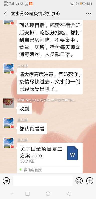 3、利用微信建群,做好公司疫情信息的搜集統計與分析工作,每日報告體溫由專門負責人統計信息并報送總公司、業主、當地有關部門。