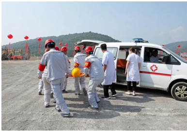 演練模擬在礦山現場1512平臺,由于雨后爆堆松軟,排險不及時,導致挖掘機進行挖裝作業時發生坍塌事故,土石坍塌砸到駕駛室,車門無法正常開啟,駕駛員被困駕駛室并且傷情不明,現場管理人員向應急指揮部報告后,立即啟動應急預案,組織人員開展傷員救助。 演練開始前兗州中材呂梁分公司項目經理王建立發表講話,并介紹了項目情況。王經理表示,呂梁分公司成立十年來一直秉承一個央企的責任,履行企業的安全管理職責,展現國有大型企業的擔當。安全工作從嚴要求,做好企業安全形象。提升服務高度、精度和寬度,為礦山行業的健康發展貢獻力量。