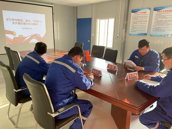 2021年4月9日,焦作晉城黨支部召開全體黨員大會,集中學習貫徹落實2021年中國建材集團、中國建材股份、中材礦山黨風廉政建設會議材料,會議由支部書記杜國賓支持,支部全體黨員參加。
