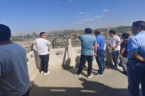 來到觀景臺邊,大家回望著來時的路,它就在腳下,不由得心懷感激,內心充滿著自豪感。向遠處眺望,奔騰的黃河在拐過大“幾”字彎沖出晉陜蒙峽谷后,進入晉陜兩省交界處變得特別溫順,母親河的水也變得特別清澈,該段也是黃河唯一一段自東向西的流向,看著奔流不息的黃河水,寓意著中華文明源遠流長,偉大的中國共產黨生生不息!